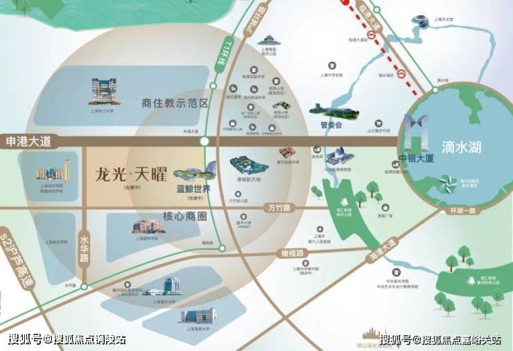 【龙光·天曜】就位于商住教示范区的门户核心位置,从上海市区自驾来临港,经S2沪芦高速(已全程免费)下闸道进入申港大道,首先映入眼帘的就会是滴水湖首个天际坐标——龙光蓝鲸世界百米酒店。这个酒店也是【龙光天曜】建面约50万方综合住区的商业配套部分。