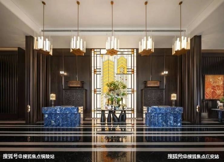 细节之处,光是一个接待台,就采用了产自玻利维亚约4500米海拔的高原矿脉——玻利维亚蓝石材,是世界上储存量最少的石材之一,非常珍贵;而大堂的柱子,也是巴西乌金奢石;