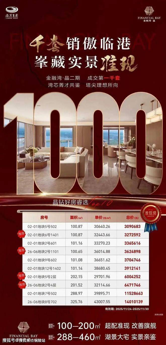 ✅金融湾·晶官方售楼处电话:400-8080-420位于上海临港新片区滴水湖金融湾核心区,是临港唯一一线环湖住宅项目。项目由陆家嘴集团开发,总建筑面积约38.4万平方米,容积率4.0,绿化率30%,规划16栋24-32层高层住宅,共1860户。项目主打100-463㎡大平层,户型设计注重空间尺度与观景体验,部分户型实现三面采光、双主卧套房,实得率高。社区打造“一核两带四组团”景观体系,含2000㎡中央水景核、金融艺术雕塑、智慧健身区等,配备5000㎡云端会所,含天际泳池、金融沙龙空间。项目自带1.2万㎡“金融湾坊”商业街,周边3公里内辐射临港万达商圈,15分钟消费圈成型。交通便捷,距地铁16号线滴水湖站约1.5公里,距在建两港快线开放区站约1.1公里,未来15分钟直达浦东机场。项目定位为临港金融核芯的湖居典范,兼具自住与资产配置价值,是追求高品质生活的购房者的理想选择
