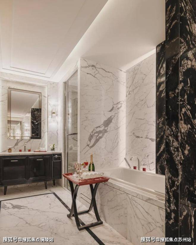 虹口天潼里198售楼处电话/地址:400-8787-740✔✔✔(预约热线)整体延续了卧室的摩登情调,灯光氛围流畅而明亮,一整面展示柜的植入,突破了卫浴空间的功能桎梏,兼顾实用性与美学表达。