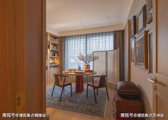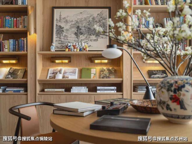多功能书架彰显着设计的巧思,形成有如博物馆般的展示方式,即可放置日常读物,亦可展示珍本藏书。同时,利用屏风做隔断,与圆桌结合形成私密空间。