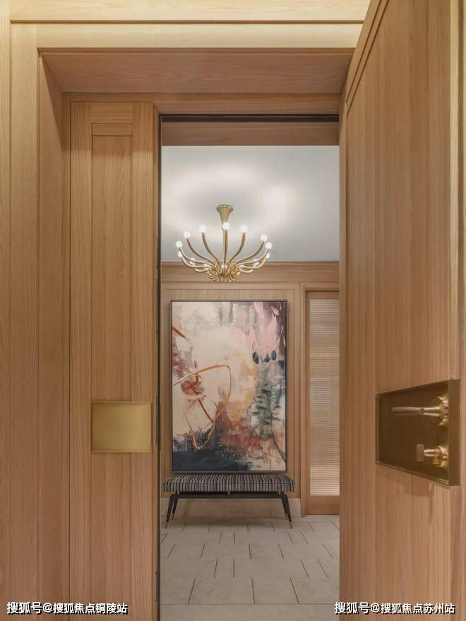 硬装上以木饰面和米色石材做结合,物料原始肌理感,表达经历时间后的沧桑痕迹。大理石地面镶嵌精致金属条,保留材质的原始感,木饰面配柔和灯光,调和出安宁澄澈的归家氛围。