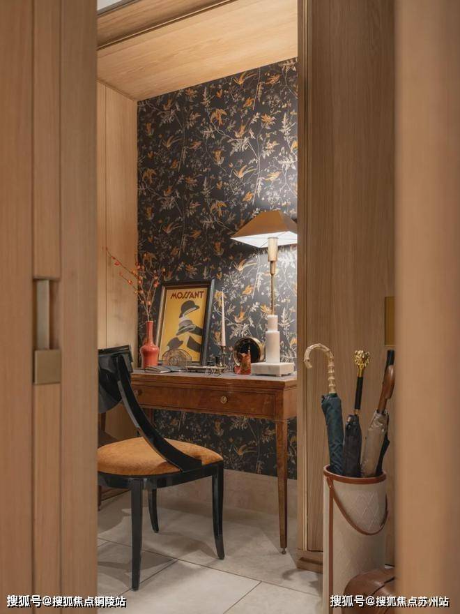 虹口天潼里198售楼处电话/地址:400-8787-740✔✔✔(预约热线)玄关具有变化性与功能多重性,壁纸融合中西方色彩和纹样,除了更衣功能,更摆放了古董书写桌,以手写文字传递信息,传递慢节奏生活方式,丰富空间的装饰和功能,目光所及视角变得丰富。