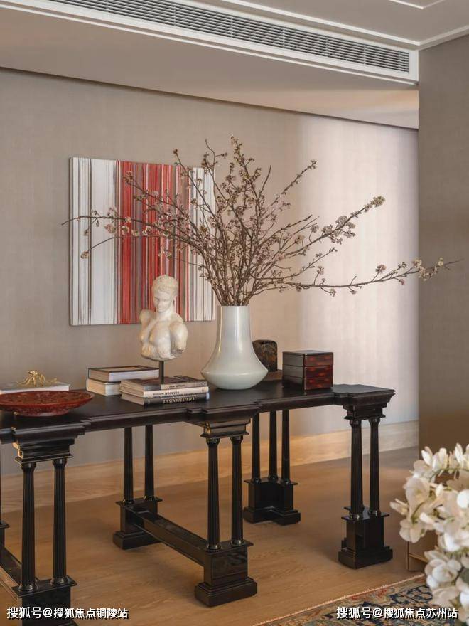 虹口天潼里198售楼处电话/地址:400-8787-740✔✔✔(预约热线)虹口天潼里198售楼处电话/地址:400-8787-740✔✔✔(预约热线)融合焕新的高柜摆放于洞石墙前,哑光与纹路丰富的米白洞石衬托出了高光黑色烤漆的深邃与沉静。而嵌入柜面的中式楠木挂屏无疑是点睛之笔,采用朱红鎏金工艺对人物和图案进行着色,展现了传统与现代完美融合的可能性。