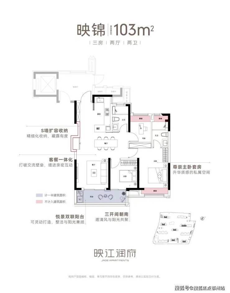 创新户型格局更是一大亮点,主推建面约89-103㎡三房,三分离卫浴、S墙收纳扩容、 一体化设计,实现了小户型大空间的极致利用。