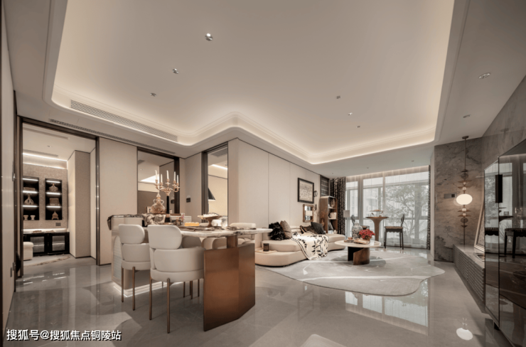 项目首层通过硬朗直线呼应柔和曲线勾勒,辅以温润石材与古铜色金属线条融合,打造东西方美学共融的艺术藏品
