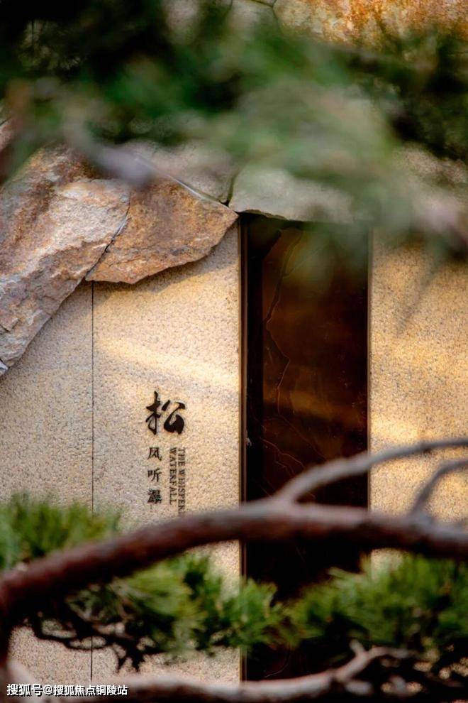 松树掩映的玻璃栈桥,一边连接着楼盘的泛会所,一边嵌入了一个崖洞一般的「灰空间」,坐入其中,听水声与鸟鸣,你会感到一种很原始很舒适的包裹感。