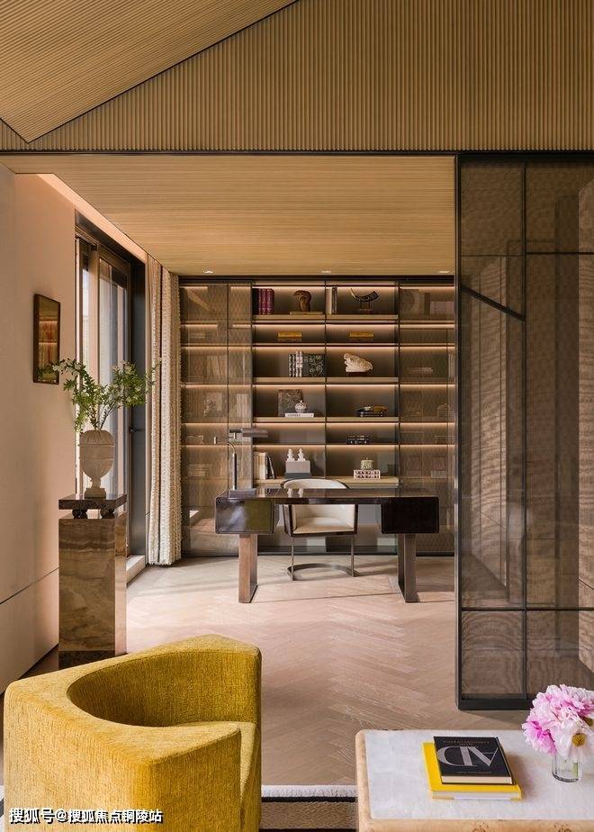 透过瀑布湍流的天光庭院,你在泳池里就可以看到会客厅中家人相伴的身影。会客厅沙发背后的镂空转角奢石景墙与金属屏风,不只是装饰品,它让会客厅与背后奢华的大堂吧隔而不离。你可以透过它,看到吧台的透光奢石景墙。