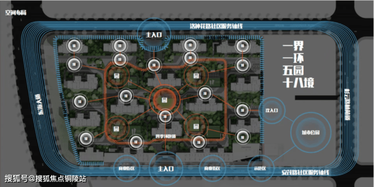 社区采用人车分流设计,在景观规划上,上实望海采用“一界一环五园十八境”景观法则,侧写九大生活场景。