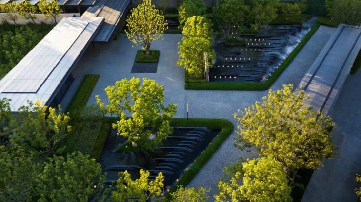 并通过跌水、涌泉和镜面水景等水景组合,将内部水景与外部水岸紧密相连。