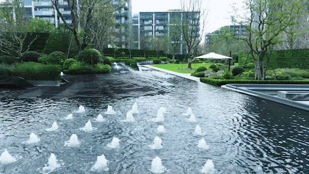 的确,水景是点睛之笔,赋予社区灵动和静谧之感,而形态各异的水景,在世博天悦,竟达到了约3000方。