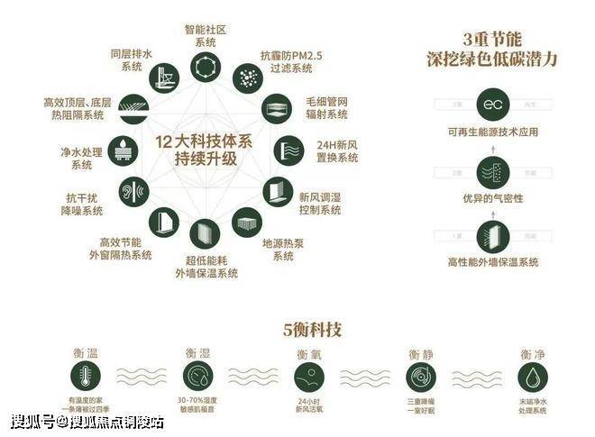 围绕阳光、水、温度、湿度、声音、空气六大环境要素,构建的12大科技系统,带来全面领先于市场的衡温、衡湿、衡氧、衡静、衡净五衡居住体验,打造更适合中国人的健康智慧科技社区。