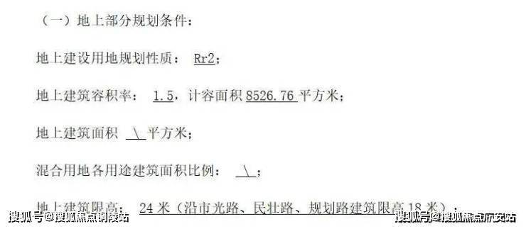 根据出让内容,该地块建筑面积只有约8526.76㎡,容积率为1.5,地上建筑限高为24米,其中沿市光路、民壮路、规划路建筑限高18米。