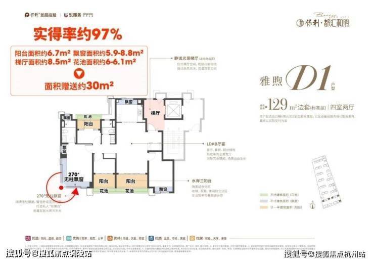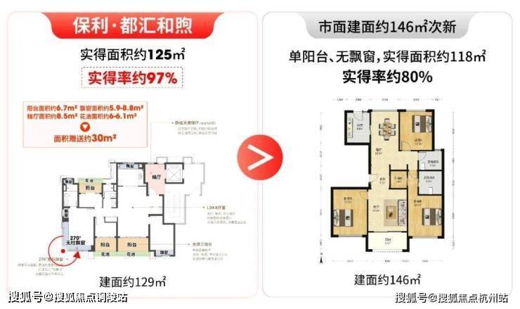 洋房标准层边套赠送面积约30㎡,实得率高达97%,相当于直接赠送约200多万价值,常规项目80%的实得率与之相比差距明显,该户型实际可享受常规155-160㎡的空间尺度。