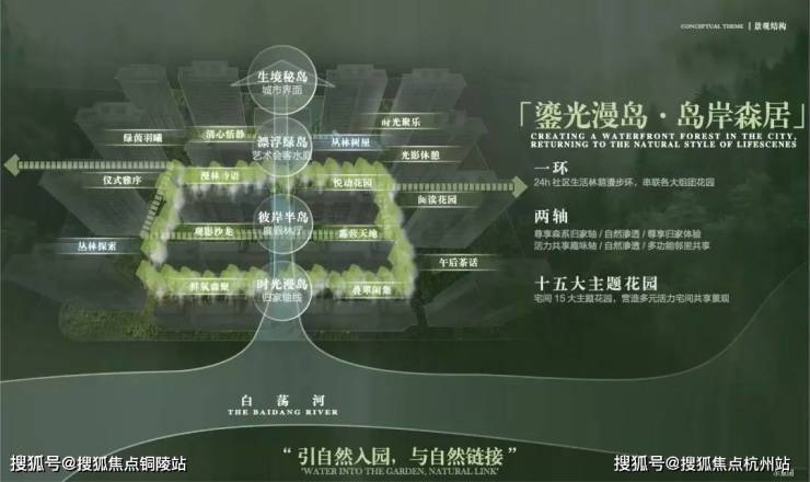 以“山水聚场”理念,规划“一环两轴十五园”景观布局,将水岸、岛屿、森林、花园、树屋作为园林节点,形成“行在景中、坐在岛中、游在林中、意在境中”的美学表达,营造出沉浸式山水活力场域。