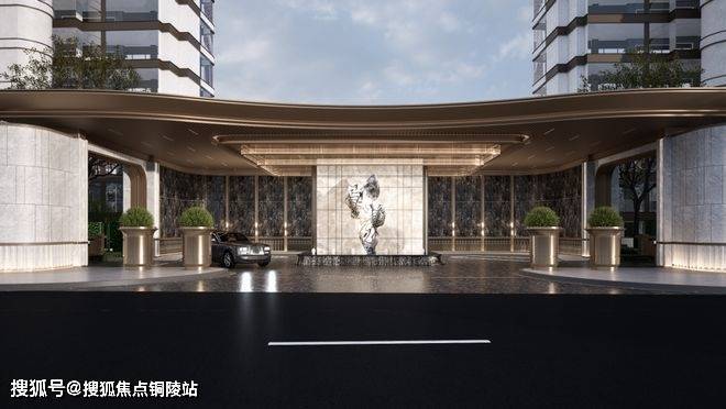 挑高金属雨棚采用极细边,中间凿壁采用透光奢石,搭配极具现代主义的雕塑彰显小区档次,背景墙面采用维多利亚黑大理石,奢华且低调。