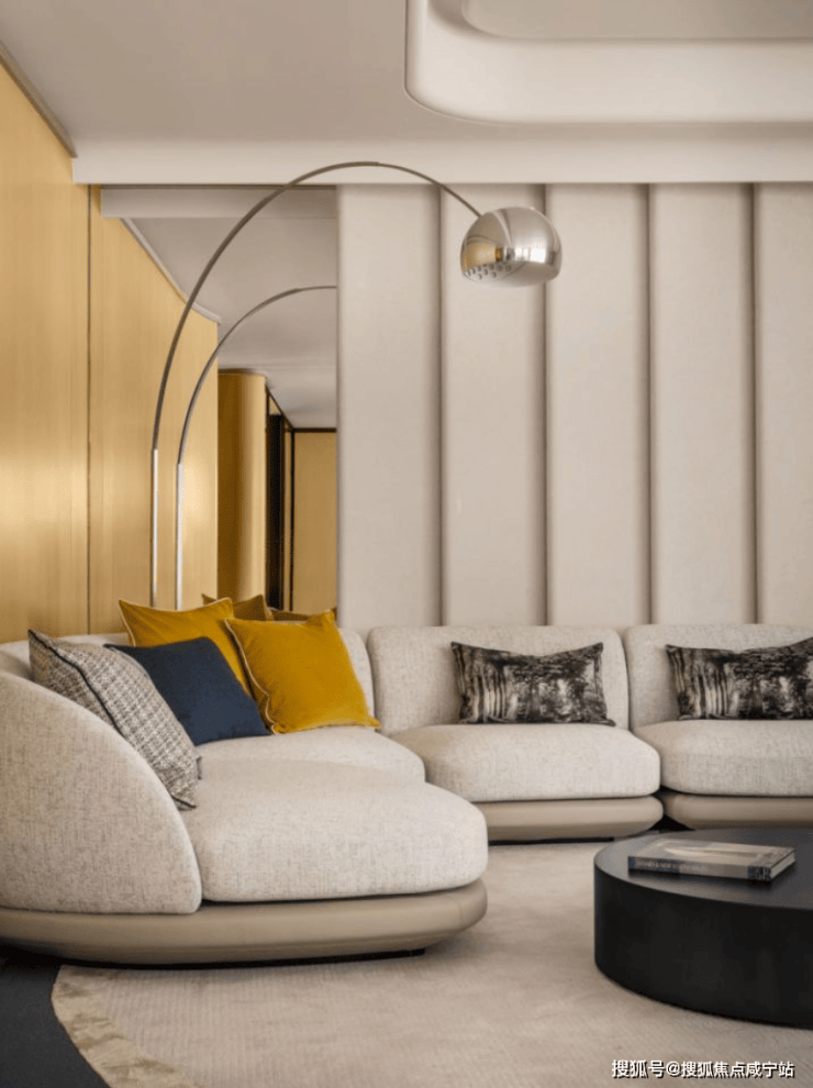 客厅空间采用大量造价昂贵的弧面设计,带来更有格调的审美价值: