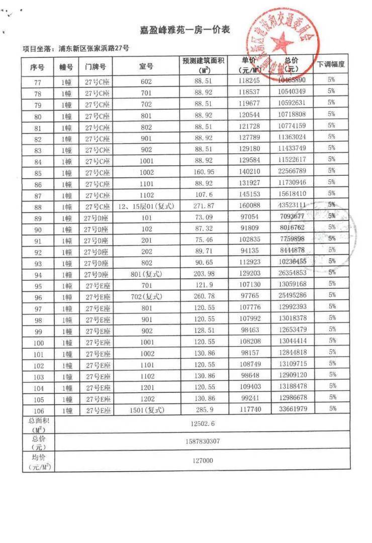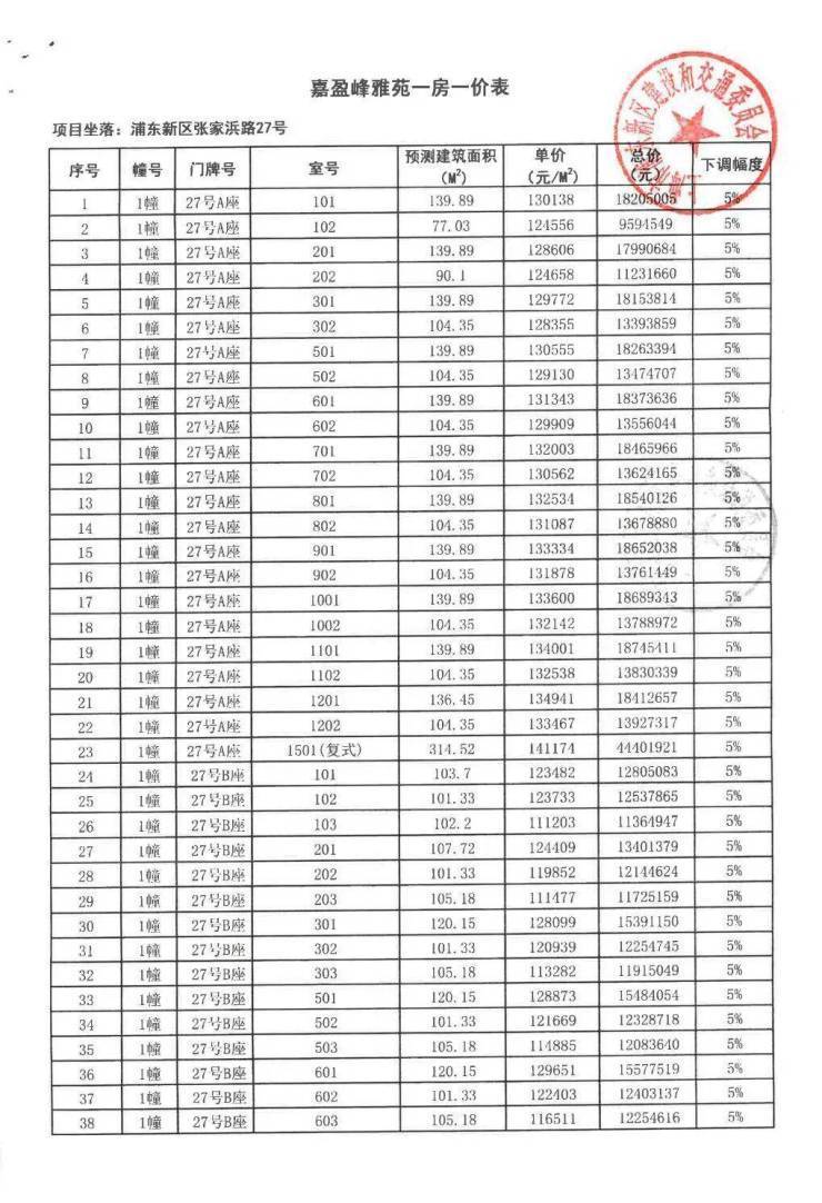 嘉盈峰一房一价表(开盘价)