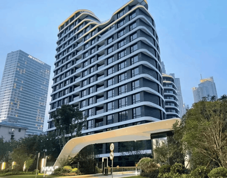 外立面采用玻璃幕墙现代简约风。建筑轮廓曲线蜿蜒,呈波浪线型层层迭高并后退,时尚感非常强。