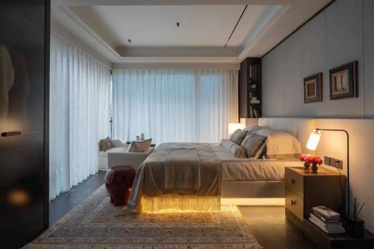 以整块奢岩破题,以皮革融入,白金沙岩板、140户型采用罗马白洞石岩板,主卧背景采用了车线工艺硬包,将豪宅标配升华为材质的史诗。
