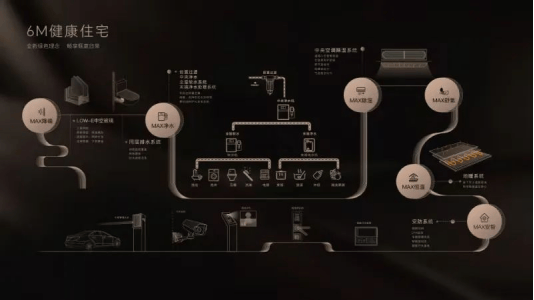 全屋配置6M健康智能住宅系统。这个智能系统系统涵盖降噪、净水、除湿、恒温、安智等多方面: