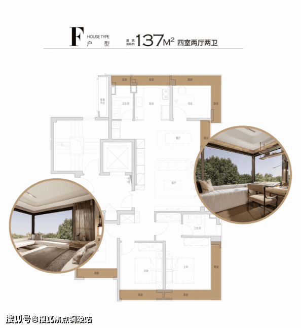 如:137㎡F户型,同样设计了双270°L型飘窗(南向主卧+北向书房)、南向双次卧飘窗、餐厅飘窗,甚至连卫生间和厨房都被飘窗环绕;厨房烟道外移设计,更形成 U型操作台面,增加操作空间,飘窗抽屉,增加收纳空间。