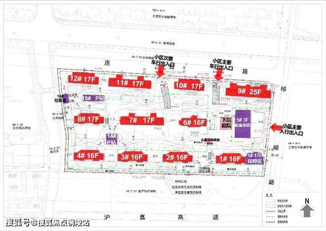 其中1号楼靠近17层的保障房,5号口为3层的配套用房;14#、15#为P站,16#为垃圾用房。