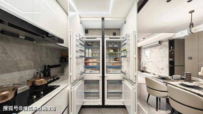 厨房空间,甄选西门子新款的抽油烟机、灶具、洗碗机等,甚至连大部分项目不配备的冰箱也是交付标准;还特别配置了轨道插座、前端净水器和凉霸;吊轨金属玻璃移门,既美观又方便清理。