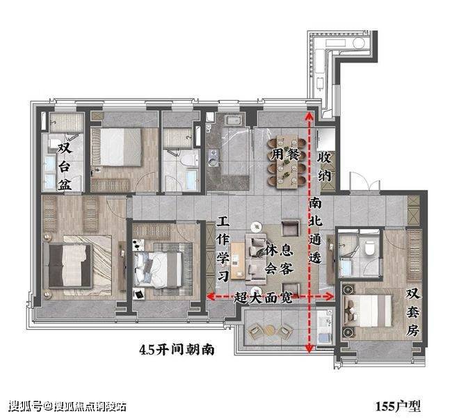 首先一梯一户的设计,给足业主的私密感,独享电梯厅、子母门更享有尊贵感,4.5米的开间朝南大横厅,双明卫设计,采光十足;LDKG大厅南北正向通透,北侧用餐区采光十足,还多做了一组收纳,南向客厅面宽足够大,沙发后面还可再加一组书桌;朝南双套房,给每位业主提供便捷私密的生活体验,主卫双台盆设计,更显豪宅的奢华感。