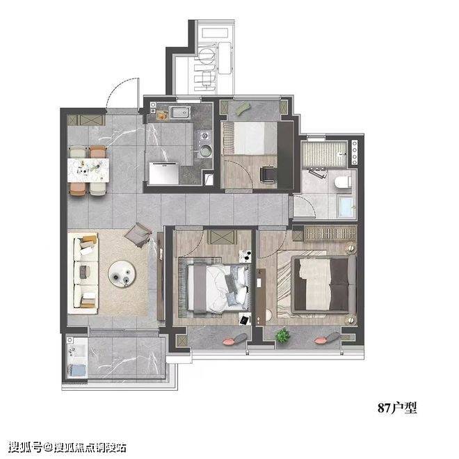 该户型贴合当代人居生活习惯,既适合三口之家小太阳家庭,也可以是三代同堂,每个人都能拥有独立空间。