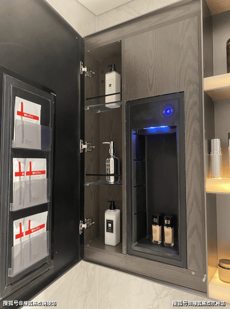 奢石台面,皮革饰面柜抽屉,侧端设置金属收纳开放格;定制镜柜,中间的透光玉石直接提升了高级感,镜柜内部配备了美妆冰箱+美妆灯条+轨道收纳!