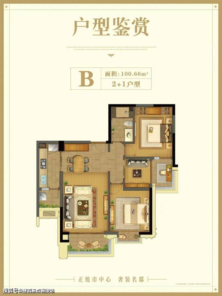 建筑面积约100㎡户型:非常有特点的2+1户型。以三个阳台的奢配,实现了功能阳台、景观阳台与拓展阳台的完美结合,赋予空间更多改造创意与居住享受。