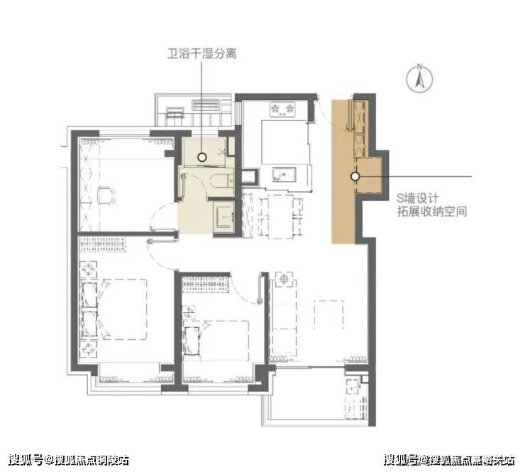 更值得一提的是建筑面积约89平方米户型“S墙创新设计”,为相邻两户创造出了额外的凹槽空间,扩展了收纳。将冰箱塞入这个凹槽,释放厨房的冰箱空间,延伸灶台面积,或者可以做岛台……让小户型不在受收纳空间的支配;