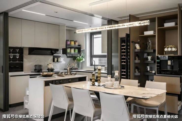 招商时代乐章艺术化的再造传统餐厨空间,可开可合的岛台设计,结合艺术玻璃移门,在提升空间灵动性的同时,也激发出餐厨空间生活的多样性。