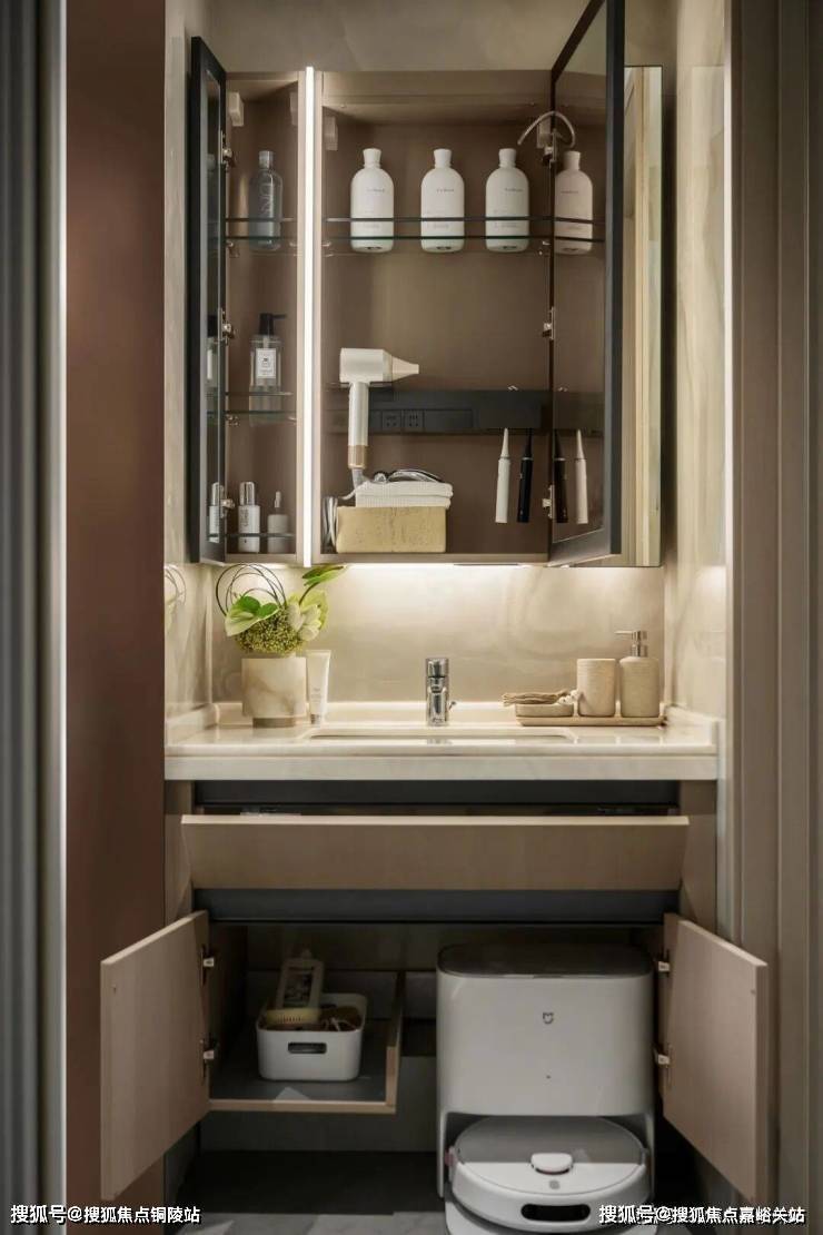 卫生间镜柜与预留洗地机位的台下柜,方便清洁用品的收纳,创造独立的家政清洁收纳空间。内嵌LED灯带的防雾镜柜,方便沐浴后的护理与美肤。