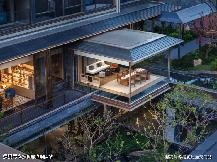 三面悬挑的玻璃结构,凌空架在水景之上。静坐其间,松风拂面,目光 穿过通透的玻璃,便能看见层层庭院的绿意与水韵 。喝茶,不只是喝茶,而是一次与天地对话的体验。