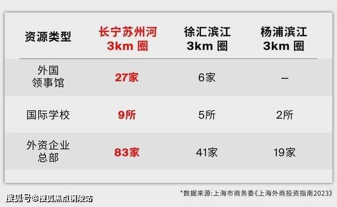 据上海市商务委《上海外商投资指南2023》数据显示,长宁涉外资源密度是徐汇滨江的2-3倍、杨浦滨江的4-10倍,是能够支撑国际客群支付溢价的!