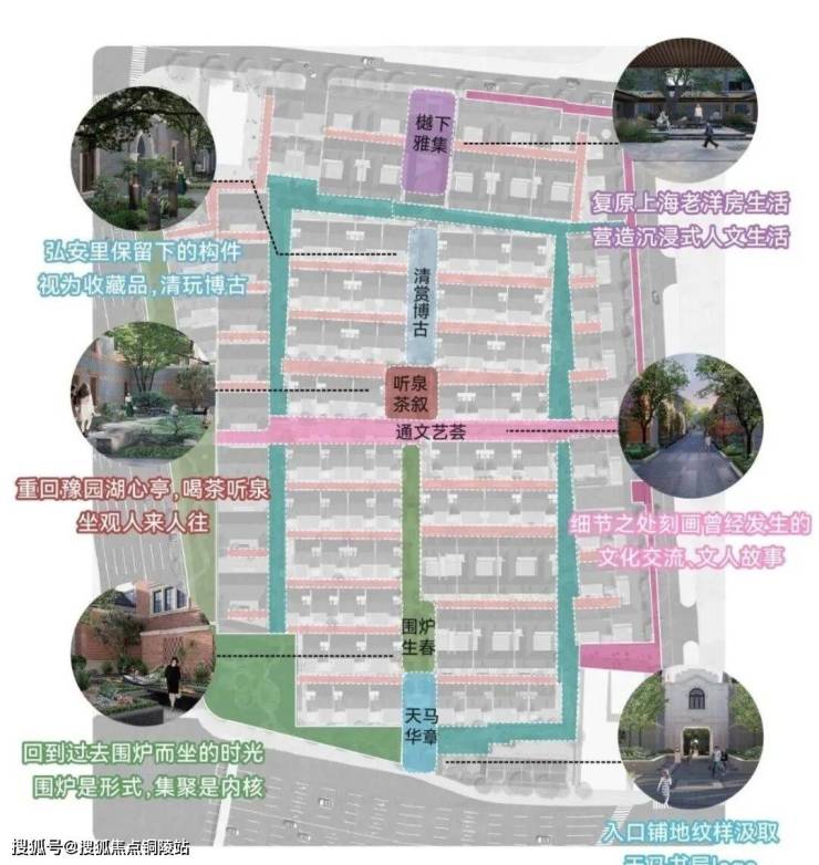 在社区的中轴上,弘安里植入记忆的符号与生活的画面,从入口处「天马华章」迈步前行,「围炉生春」「通文艺荟」「听泉茶叙」「清赏博古」贯穿到此次实景开放的「樾下雅集」,海派生活画卷昨日重现。