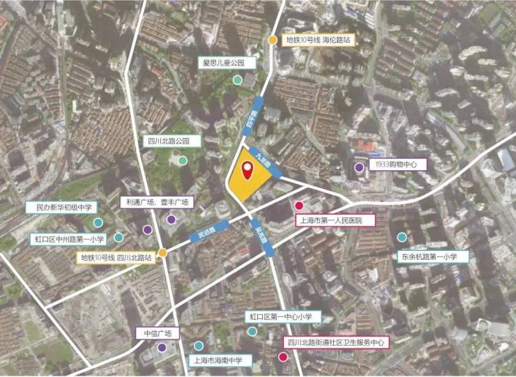 地块属于虹口内环内的嘉兴社区,就在第一人民医院北侧,南侧约200米就是北外滩,北侧即为瑞虹新城,项目直线距10号线四川北路站约400米,是今年虹口区非常重要的一个新房供应。
