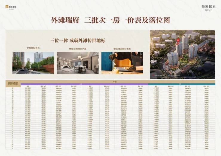 最新消息:外滩瑞府最后批次入市!推出4号楼,建面约124-165㎡3-4房,总价约1554-2784万。