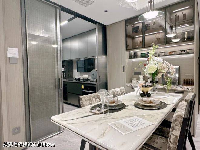 家的温情欢聚场:在餐厅区域,我们安置了一件餐边柜,其透光台面设计采用了雪山飞狐奢石材质,该餐边柜在收纳和储物功能上表现出色。