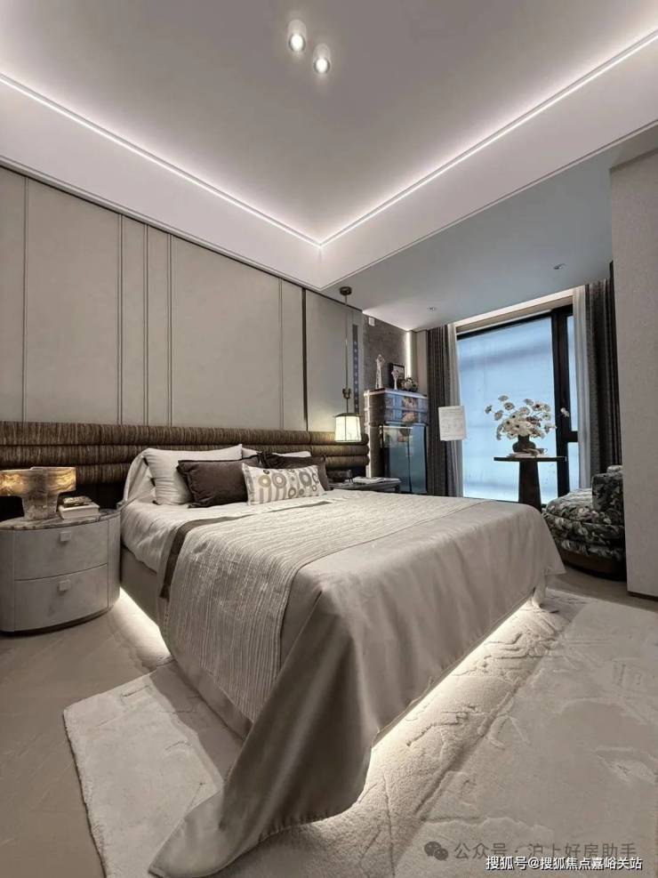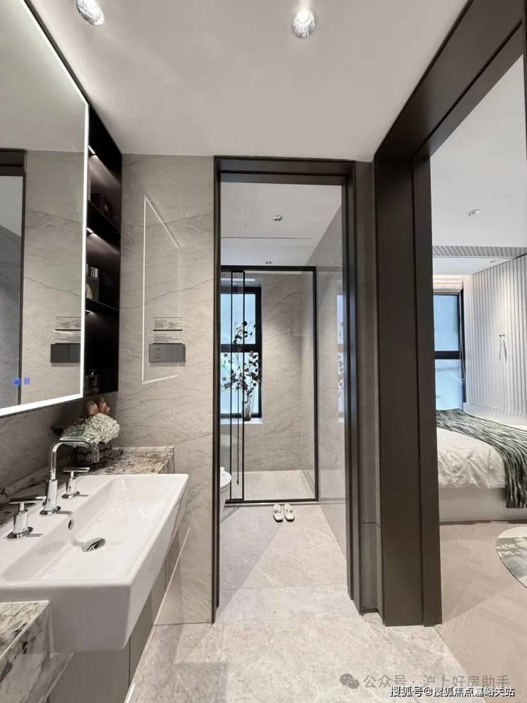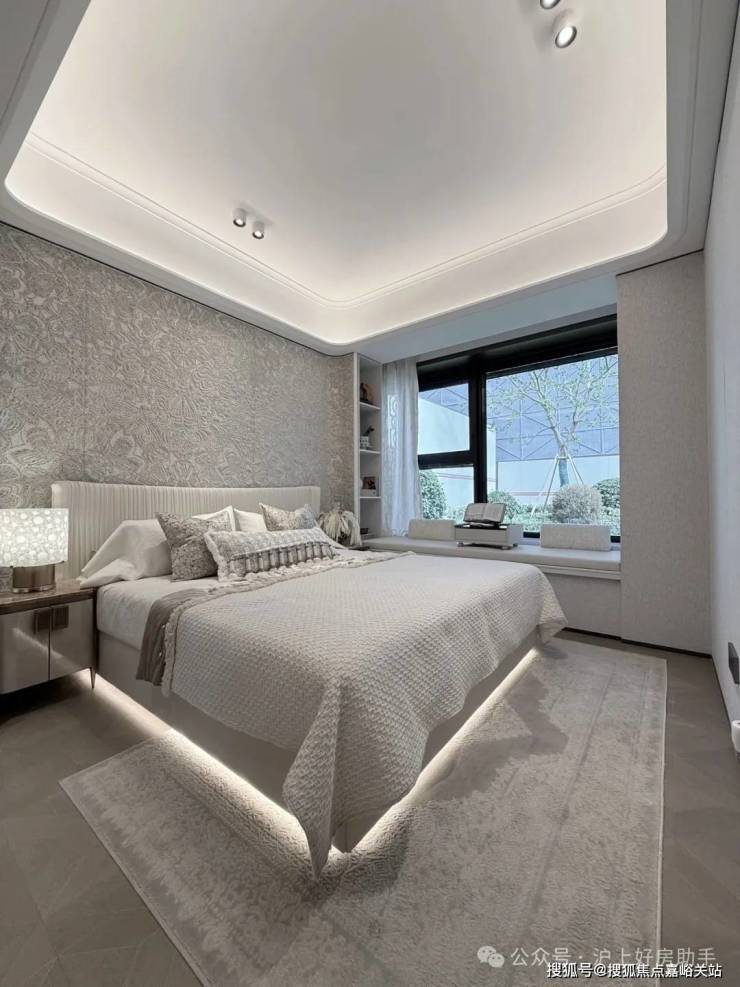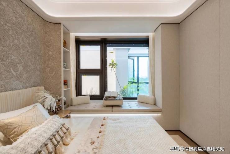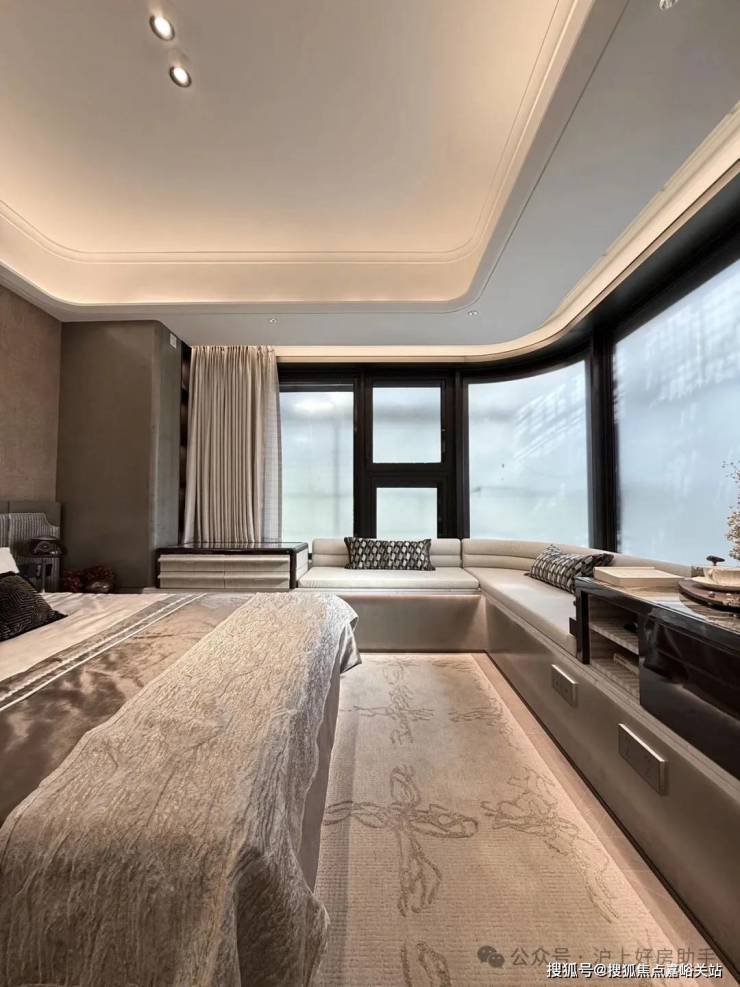 豪华的套房设计,北侧卫浴飘窗+南向床边双飘窗的设计,更是把这个空间的视野和收纳空间延展开来,尺度感真的很惊人。
