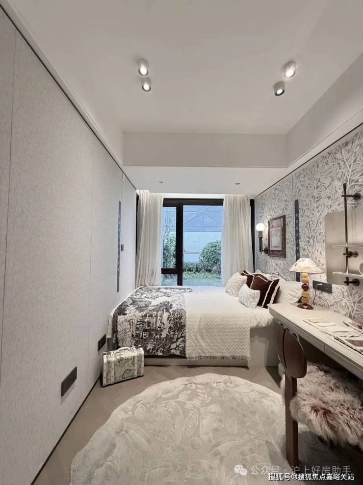首先,这是北次卧,不仅能放下一张完整的床,还能放下一张大尺寸的办公桌或者是梳妆台,甚至还有空间做一些收纳柜和床头柜等。这样的尺度感和实用性,真的比一般建面约120㎡以上的宽绰3房更加惊人。