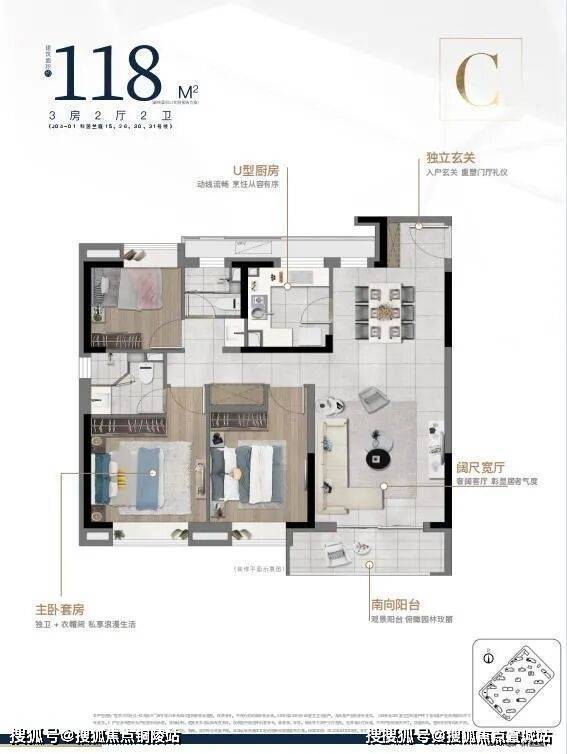 建筑面积约100㎡/118㎡三房两厅两卫,三口之家/三代同堂从容满足,南北通透外,餐客一体,动静分离居住舒适度更高,三开间朝南,三房全飘窗,日常在阳台上饲花弄草,生活将被赋予高仪式感。