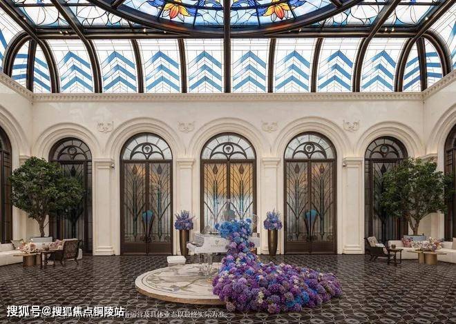 穿过玉兰门庭,高定铝板、石材和大面宽玻璃打造的繁花立面映入眼帘,繁花冠顶同源玉兰门庭,步步生花,同时,项目摒弃传统直角,采用曲面柱廊与弧形玻璃幕墙,新奢与设计感扑面而来: