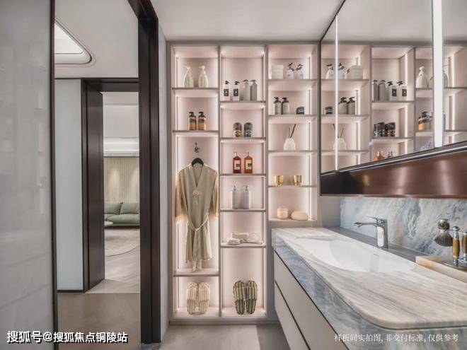 卫生间镜柜配备美妆冰箱、倒置抽纸等等定制分隔。