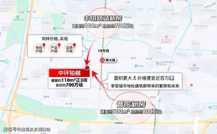 同样是地铁房,往前一站的桃浦百平三房,已经是800万级,「中环铂樾」首开66000元/平的惊喜均价,总价约700万+,同样是三房产品,劲省100-200万!