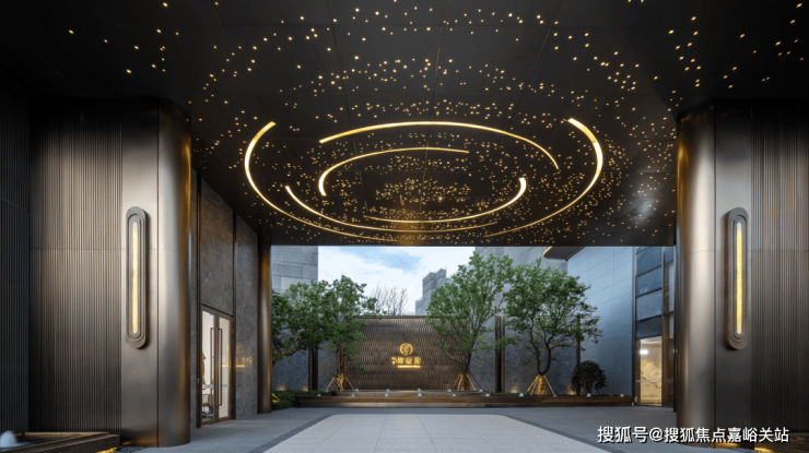 项目北区的社区归家主入口,景墙取自“水”和“鱼”的元素,诗意静谧、南区入口归家大堂,联动地下采光会所;