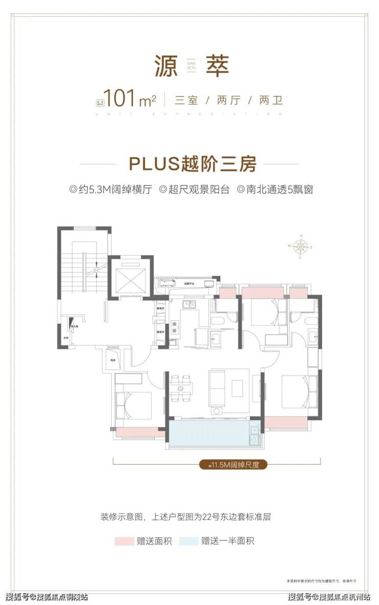 建面约101㎡3房2卫户型,非常标准的飞机户型。