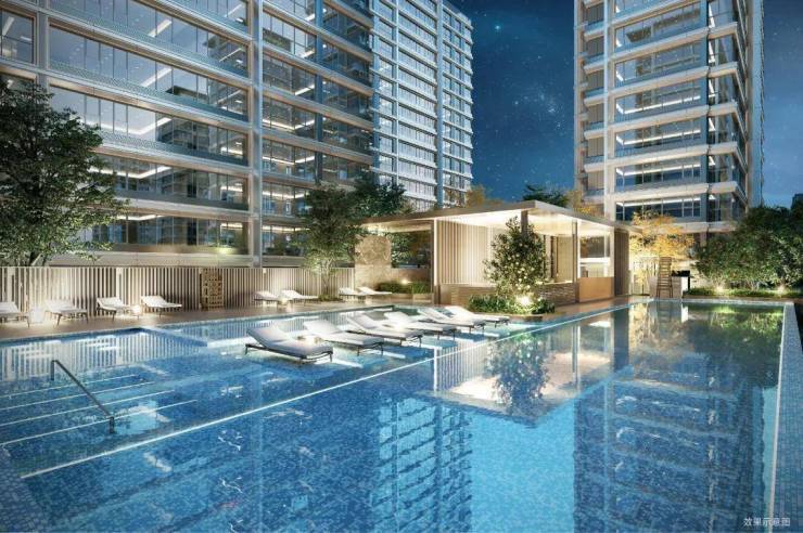社区规划格局采用中轴对称,内部有室外游泳池、景观廊道和中心大花园,部分楼栋设置架空层,建筑里面以非对称形式的设计手法,打造现代化理念。